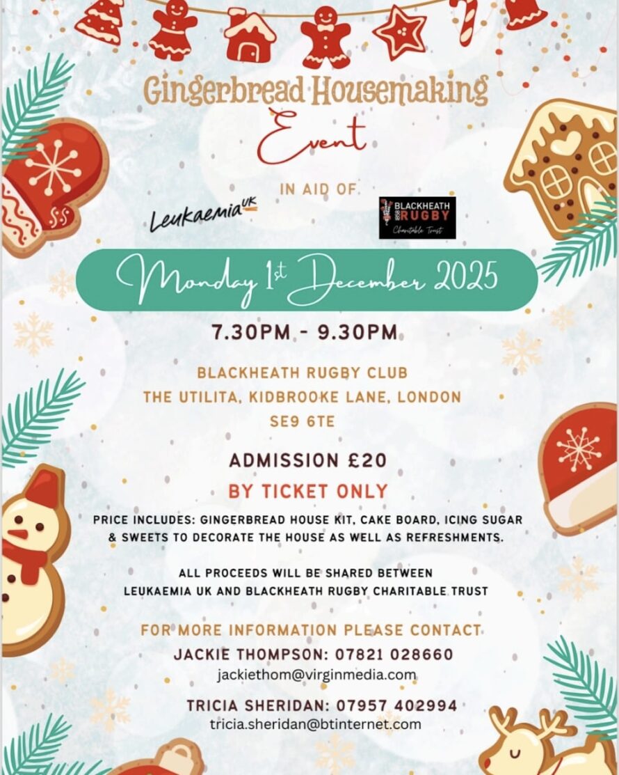 Come and join the fun at The Utilita on Monday 1 December, and make your very own gingerbread house! Starting at 19:30, Tricia and Jackie will host the fundraising evening, proceeds from which will be split between Leukaemia UK and the Blackheath Rugby Charitable Trust. The cost is £20 and you will get all you need to make and decorate …