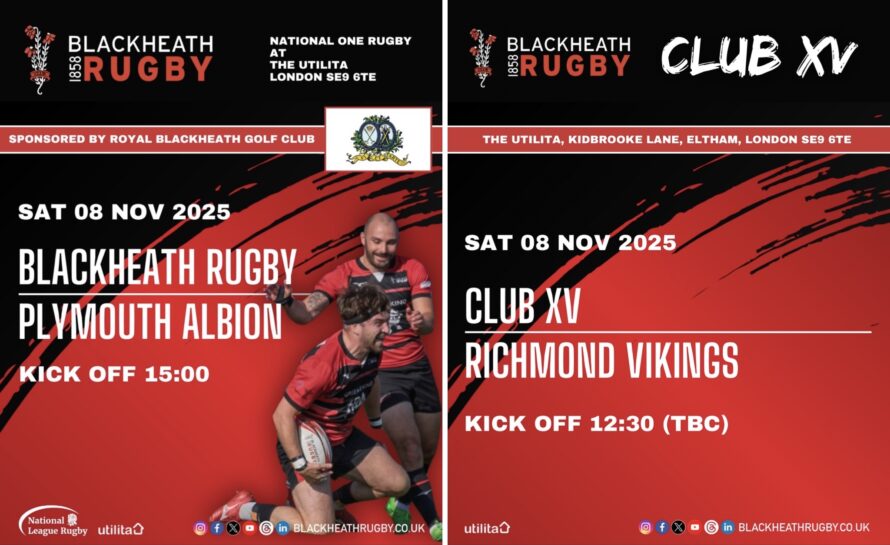 Blackheath Rugby welcomes Plymouth Albion to The Utilita on Saturday for the next National One home game of the 2025-26 season. The match kicks off at 15:00 and is sponsored by the Royal Blackheath Golf Club. And it’s a double header, with the Club XV playing Richmond Vikings and kicking off at 12:30 (TBC – please keep an eye on …