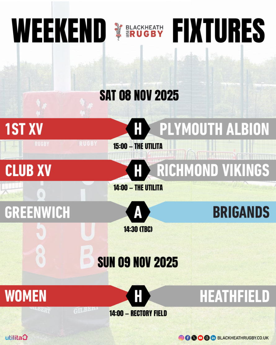 Good luck to the Blackheath senior teams who are in action this weekend: Saturday 08 November 🏉 1st XV home to Plymouth Albion, KO 15:00 🏉 Club XV home to Richmond Vikings, KO 14:00 🏉 Brigands away to Greenwich, KO 14:30 (TBC) Sunday 09 November 🏉 Women home to Heathfield, KO 14:00 #blackheathrugby #blackheathfc #club #oneclub …