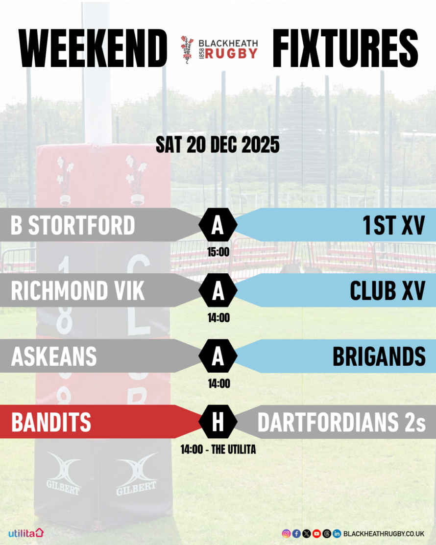 Good luck to all the Blackheath Senior teams playing this Saturday! The Women are now on their Christmas break, so it’s all about the men this weekend! Saturday 06 December 🏉 1st XV away to Bishop’s Stortford, KO 15:00 🏉 Club XV away to Richmond Vikings, KO 14:00 🏉 Brigands away to Askeans, KO 14:00 🏉 Bandits home to …