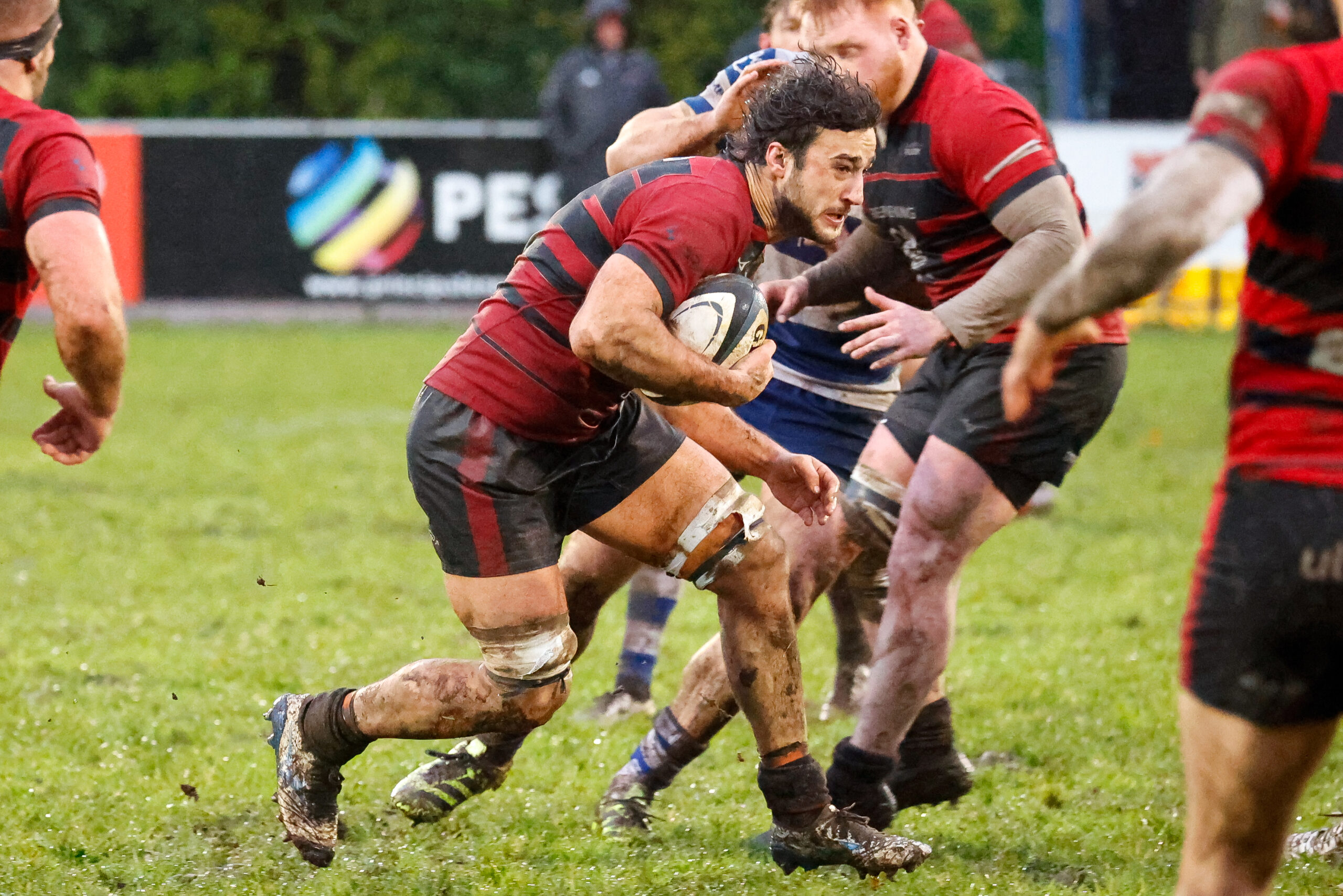 The next period of play reflected the first 20mins: The Club forwards making powerful carries and the scrum a useful weapon where we had an advantage. The OAs defence was perhaps the best we’ve faced to date in league competition for several years, forcing Fly Half Nathan Brindle to be more of crash ball 10 than his frame perhaps is designed for, and their backline threatened throughout. A consistent feature throughout the match was both teams losing the ball in contact too often in the wet & muddy conditions, resulting in both more scrums and lots of counter attacks.