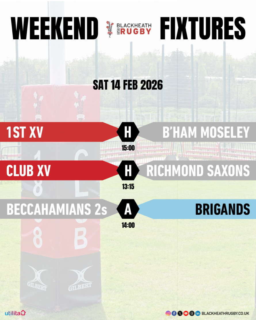Good luck to the Blackheath Senior teams this weekend! Saturday 14 February 🏉 1st XV home to Birmingham Moseley, KO 15:00 🏉 Club XV home to Richmond Saxons, KO 13:15 🏉 Brigands away Beccahamians 2s, KO 14:00 #blackheathrugby #blackheathfc #club #oneclub