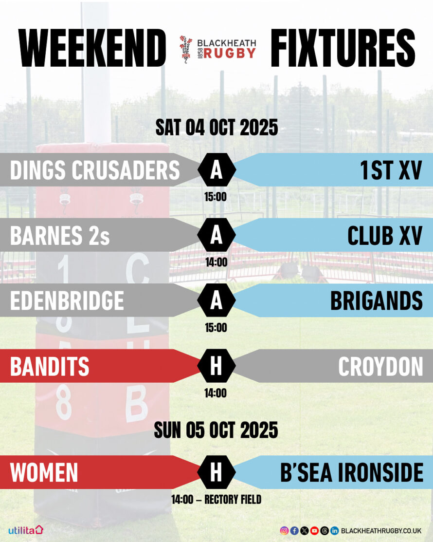 Good luck to all five Blackheath senior teams who are in action this weekend. Both the Bandits and the Women are at home, and would love to have your support! Saturday 04 October 🏉 1st XV away to Dings Crusaders, KO 15:00 🏉 Club XV away to Barnes 2nd XV, KO 14:00 🏉 Brigands away to Edenbridge, KO 15:00 …