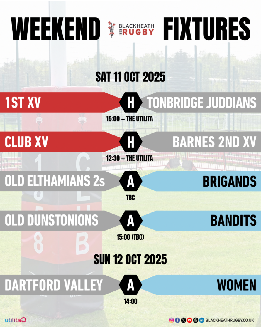 Good luck to all five Blackheath senior teams who are in action this weekend. Don’t forget — members can bring two guests for free on Saturday at the Utilita! Saturday 11 October 🏉 1st XV home to Tonbridge Juddians, KO 15:00 🏉 Club XV home to Barnes 2nd XV, KO 12:30 🏉 Brigands away to Old Elthamians 2s, KO …