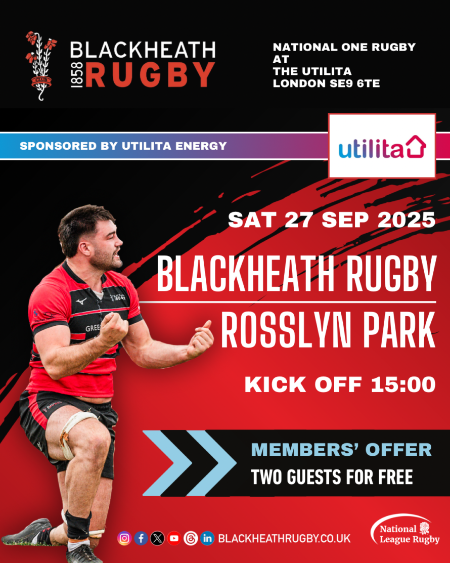 Blackheath Rugby welcomes Rosslyn Park to The Utilita on Saturday for the next National One home game of the 2025-26 season. The game kicks off at 15:00. This game is special for many reasons! All members can bring TWO GUESTS FOR FREE * It’s a local derby against Rosslyn Park, who are always welcome at The Utilita The Women’s Rugby …