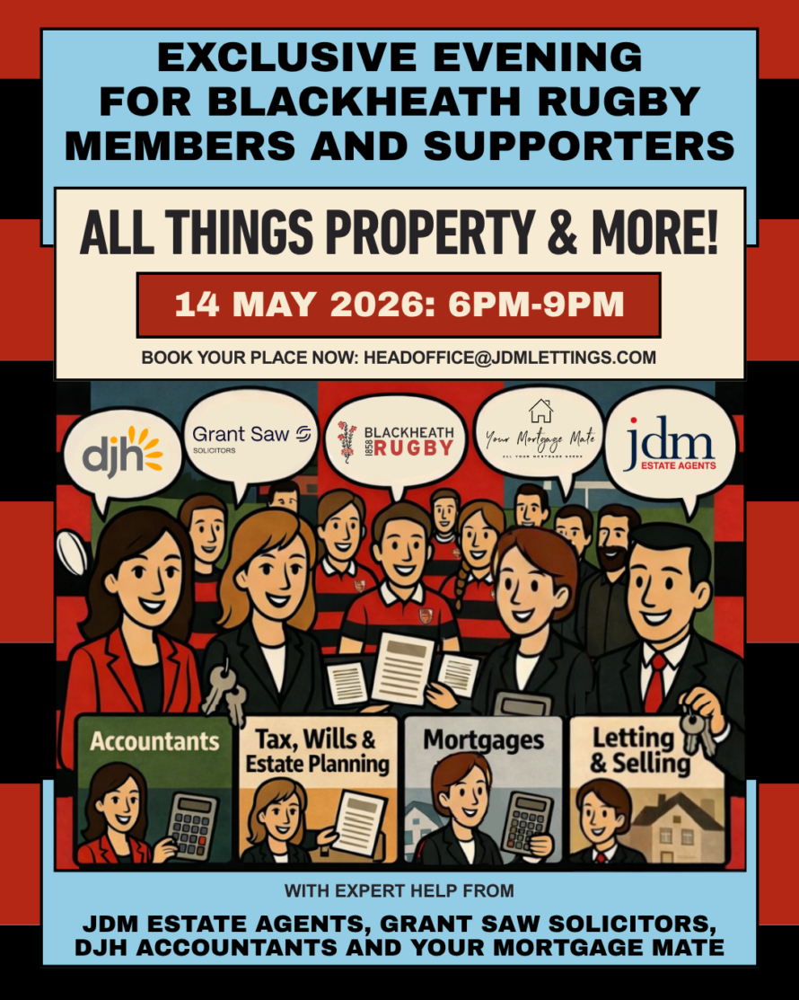We’re all experiencing a changing property market at the moment, with high inflation, increasing mortgage rates, rising energy costs, and changes to the Renters Rights Act. To help navigate this maze, Blackheath Rugby is hosting an open evening for its members and supporters in conjunction with jdm Estate Agents, Grant Saw Solicitors, Your Mortgage Mate and DJH Accountants, who will …