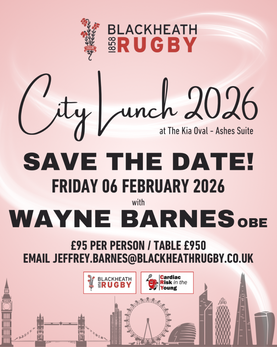 On Friday 6 February 2026, the Ashes Suite at the Kia Oval will once again open its doors to host the Blackheath Rugby City Lunch. The annual event is held to raise money for Cardiac Risk in the Young and the Blackheath Rugby Development Fund, and we’re hoping to top the 250 attendees of 2025’s successful fundraiser.