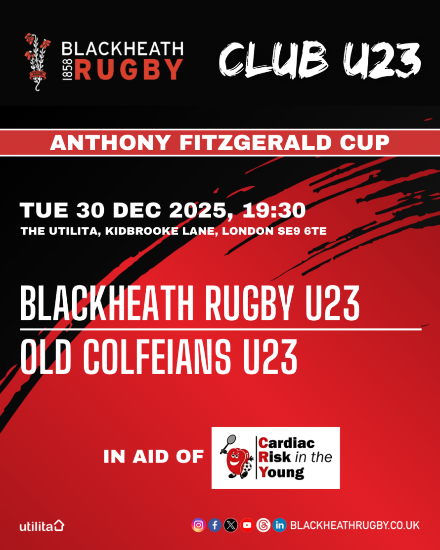 Our senior teams are taking a well-deserved break over the festive period, but rugby is not stopping completely! We have the annual Anthony Fitzgerald Cup game to look forward to on Tuesday 30 December at 19:30, with our U23s taking on our good friends Old Colfeians, in aid of a wonderful charity, Cardiac Risk in the Young (CRY).
