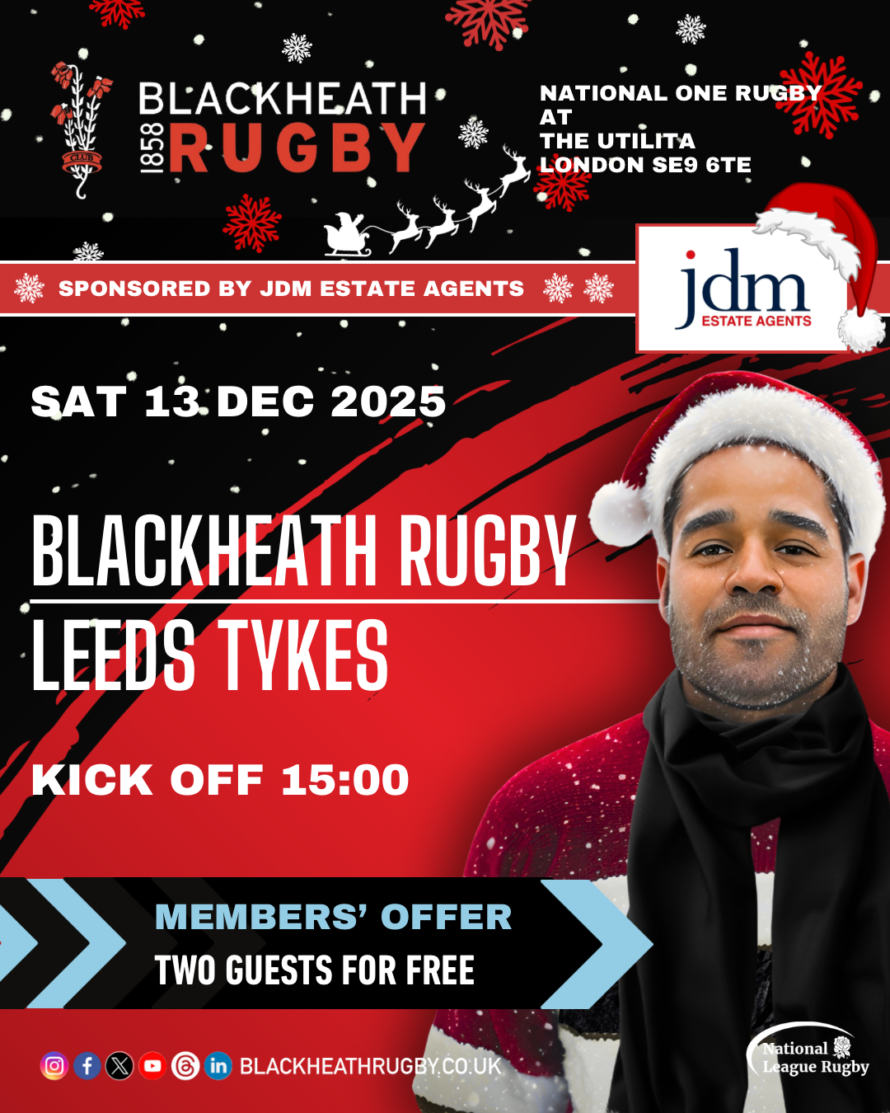 Blackheath Rugby welcomes Leeds Tykes to The Utilita on Saturday for the final National One home game of 2025. The match kicks off at 15:00 and is sponsored by jdm Estate Agents.