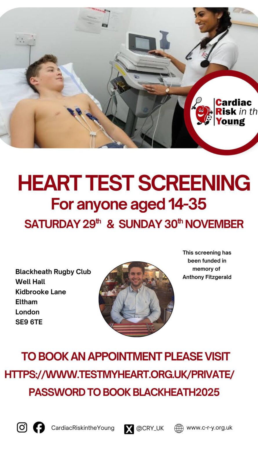 Are you aged between 14-35? If so, book an appointment to have a heart test screening at the Utilita on Saturday 29 November or Sunday 30 November.