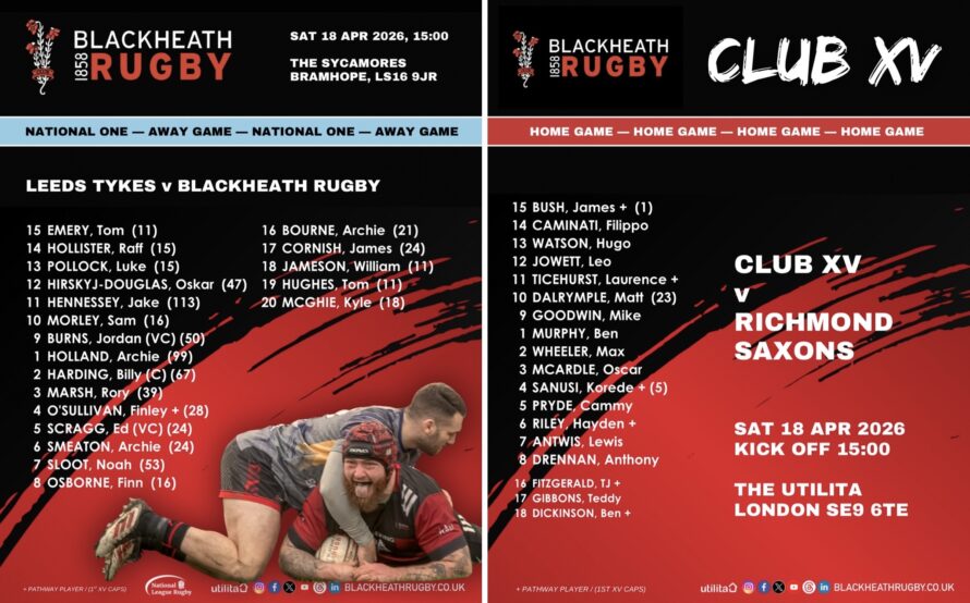 National One continues apace tomorrow as Blackheath Rugby takes to the road and travels to West Yorkshire to play Leeds Tykes. The game at Sycamore Road kicks off 15:00.